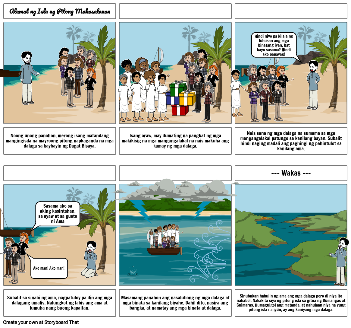Araw-araw makikita ang pitong dalagang masayang nagsasagawa ng mga gawaing. Alamat ng Isla ng Pitong Makasalanan Noong unang panahon isang matandang mangingisda at ang kanyang pitong anak na dalaga ang naninirahan sa isang tahanang nakaharap sa baybayin ng Dagat-Bisaya. Nagustuhan ng mga ito ang mga dalaga kaya sila.