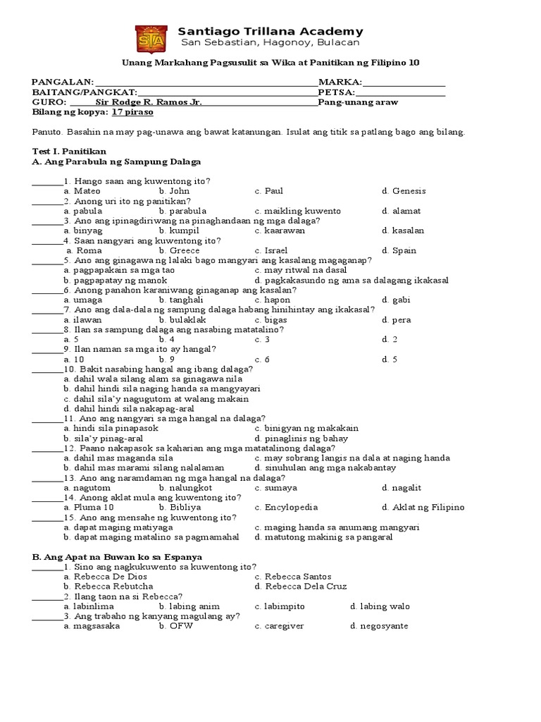 Filipino Teacher at Philippine Science High School-Main Campus. Preview 10 questions Show answers. Pinag-usapan na rin ang tungkol sa ipagkakaloob na dote ng pamilya ng binata sa pamilya ng dalaga.