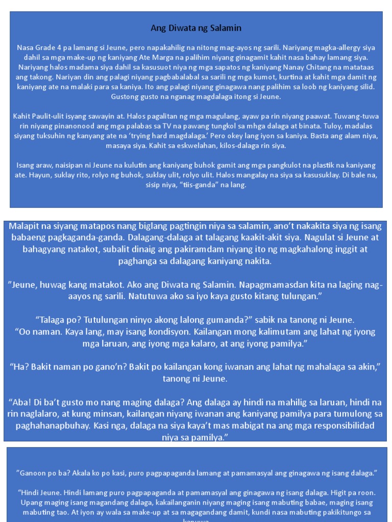 Natuwa ang nanay ngnang malaman na nakapasa ang anak niya. Ang panliligaw ay isa sa tradisyon ng mga Pilipino mula noon hanggang sa kasalukuyan. Naglaban rawdaw ang mga lalaki sa kalsada.