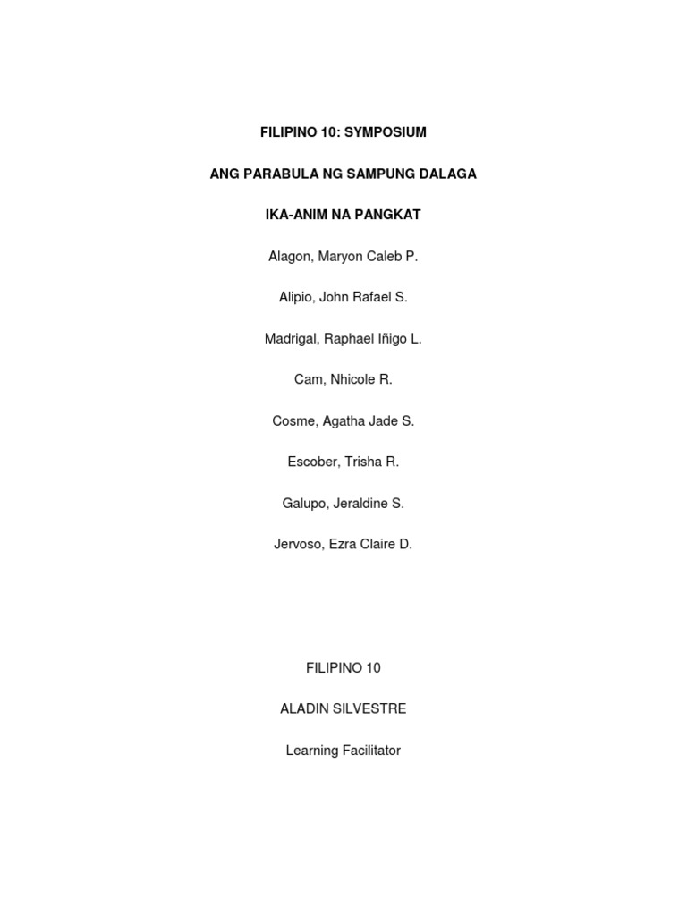 Now up your study game with Learn mode. Nagulat si Angela ng tangkang ipapasok ng ama ang dila nito sa kanyang bibig awtomatikong naitulak niya ang ama. PARABULA NG SAMPUNG DALAGABUODNakwento ni Hesus ang tungkol sa lipon ng mga dalaga o abay na kasali sa isang magaganap na kasalan.